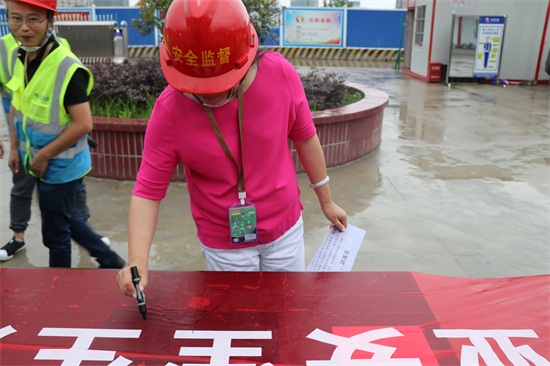 活動中,質安部部長朱波首先向大家宣貫了《天創公司2017年安全生產月活動方案》,本年度“安全月”將舉辦包括安全微黨課、安全教育、安全演練、我為安全獻一策等在內的共計17項活動,朱部長根據活動提綱對活動的開展提出了具體要求。質安部羅冰隨后帶領現場全體人員進行了莊嚴的安全生產月活動宣誓,并在安全生產月主題“全面落實企業安全生產主體責任”橫幅上簽名。
